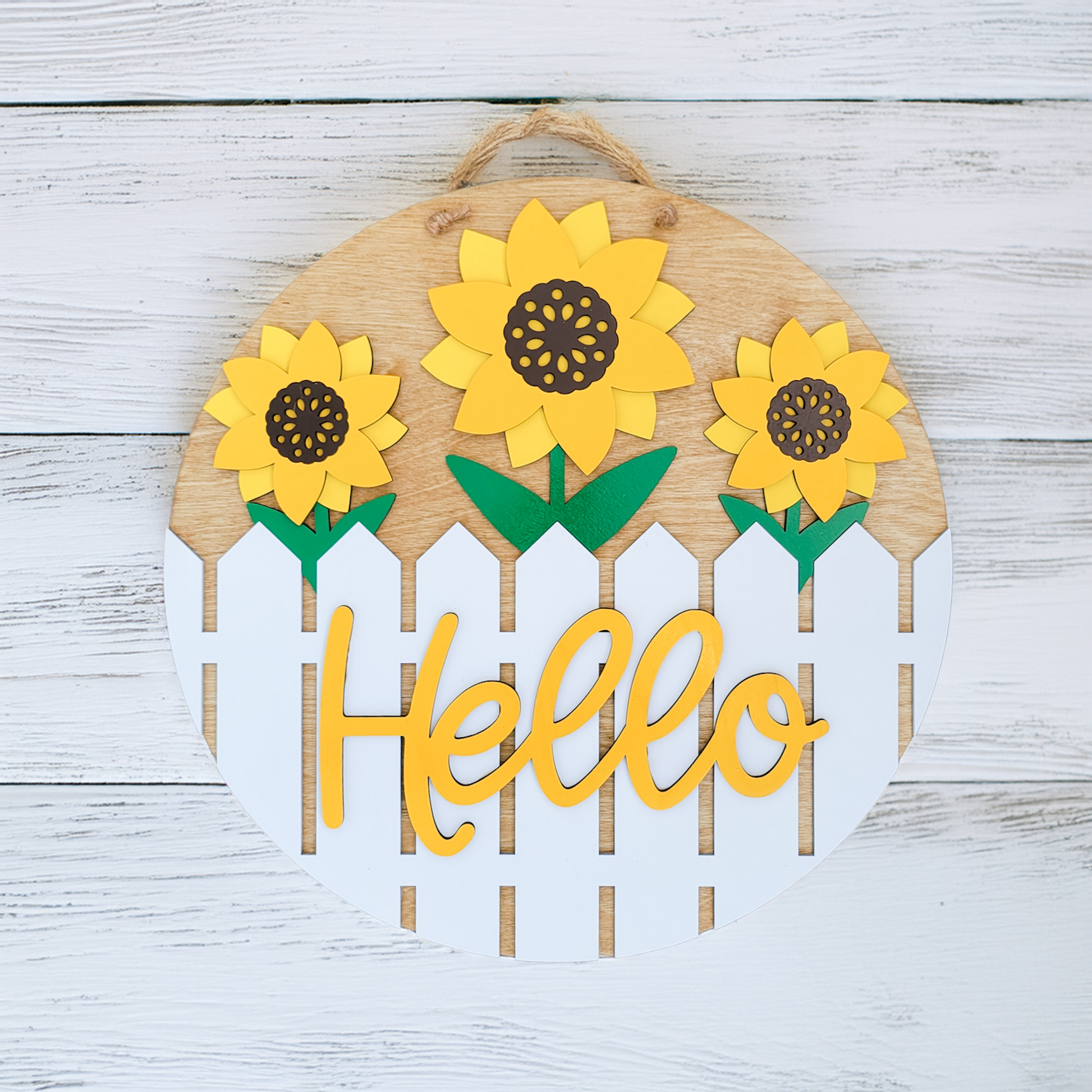 16" Hello Sunflower Fence Round Wooden Door Hanger