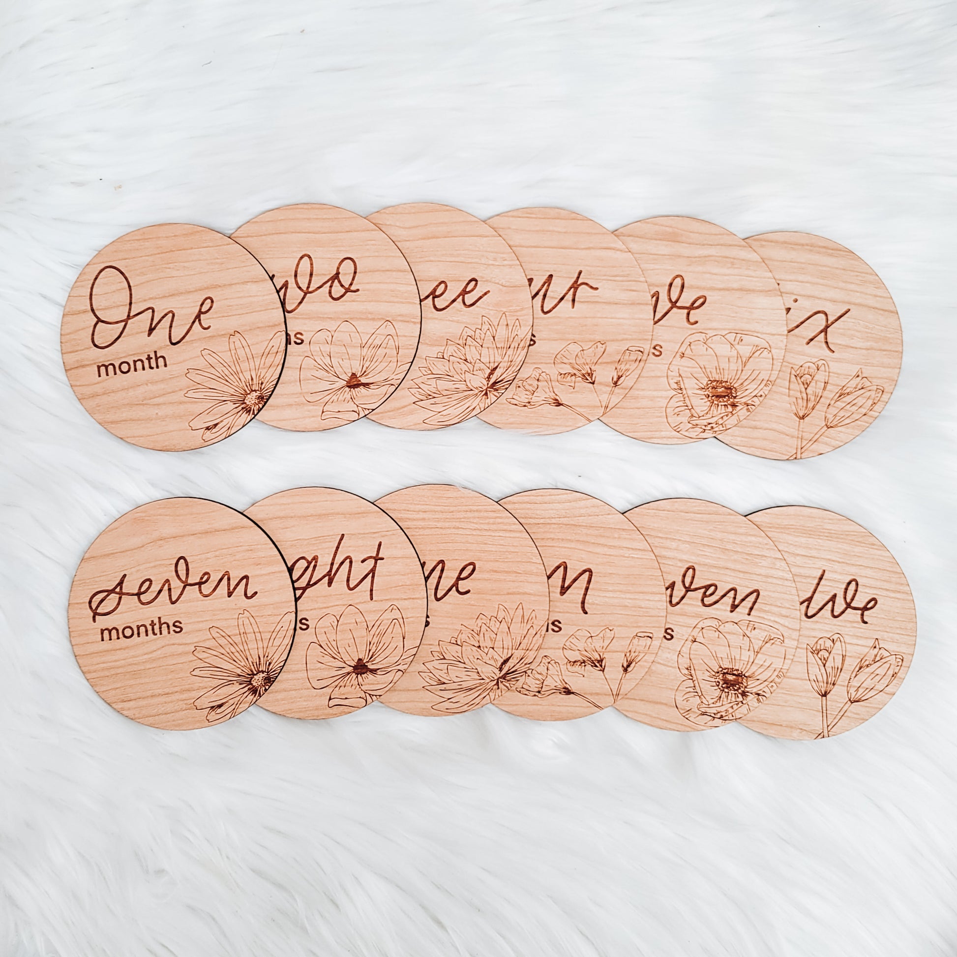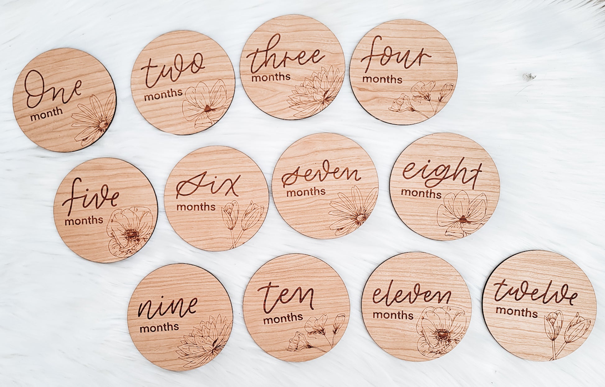 These wooden circles are the perfect way to commemorate each monthly mile stone for your baby. Made from cherry wood they may naturally darken over time.