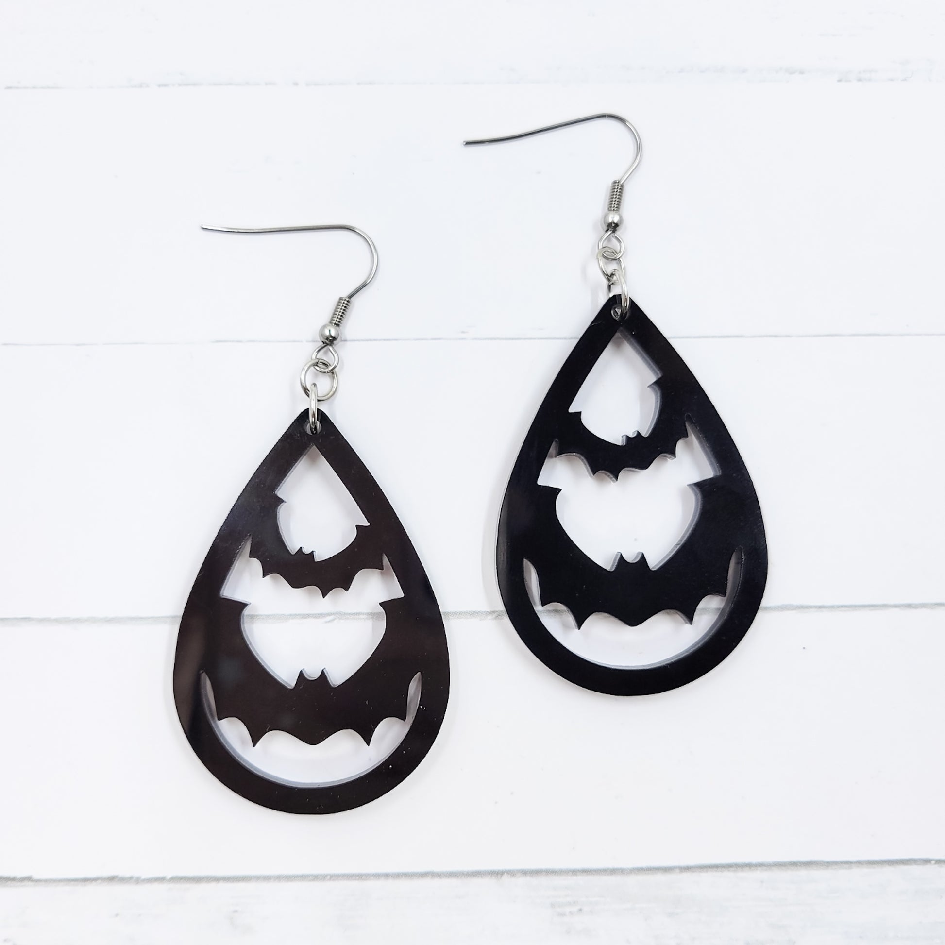 Earrings are made from black gloss acrylic. Earrings are on stainless steel fish hook ear wires with rubber ear nuts.