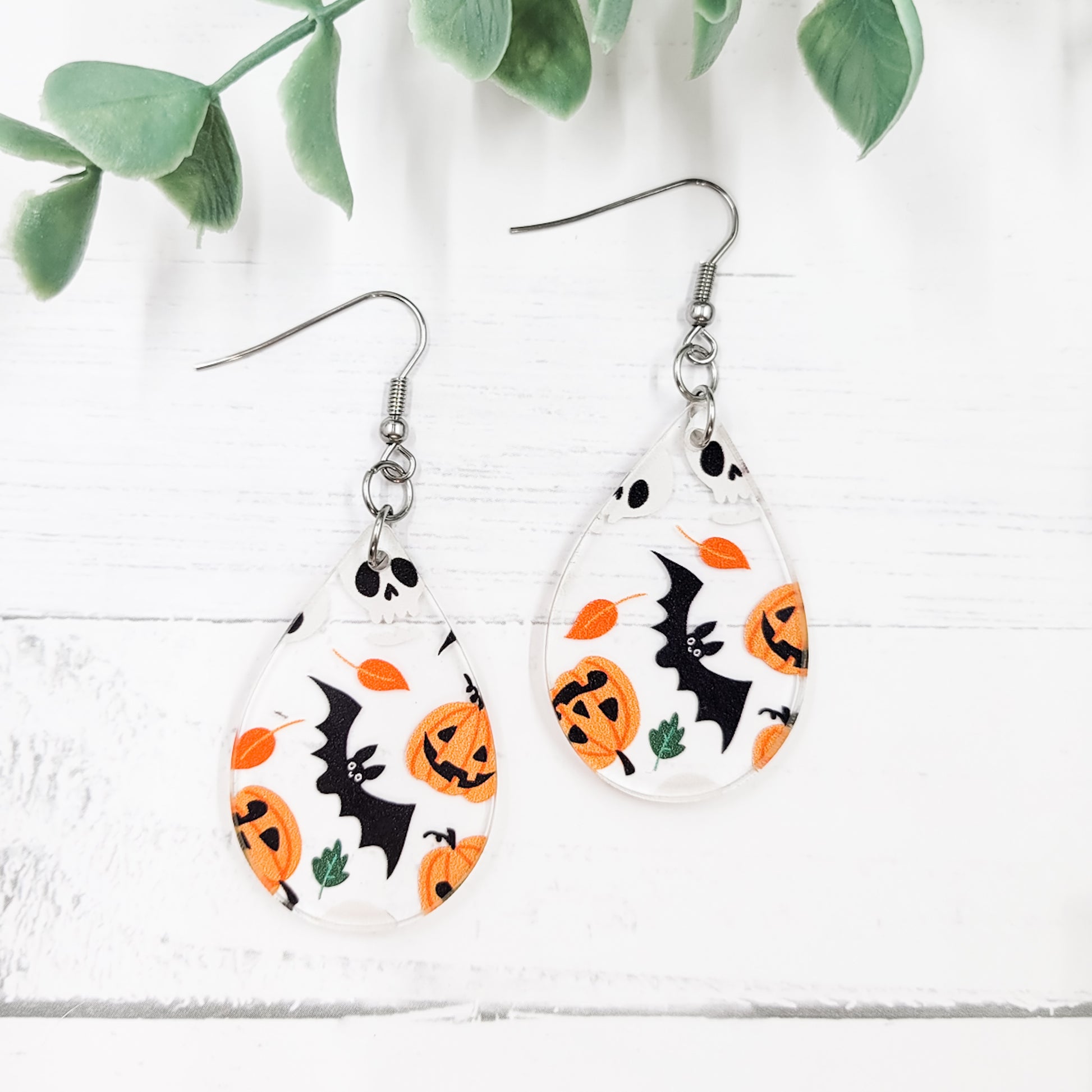 Bats, Pumpkins & Skulls Acrylic Teardrop Dangle Earrings