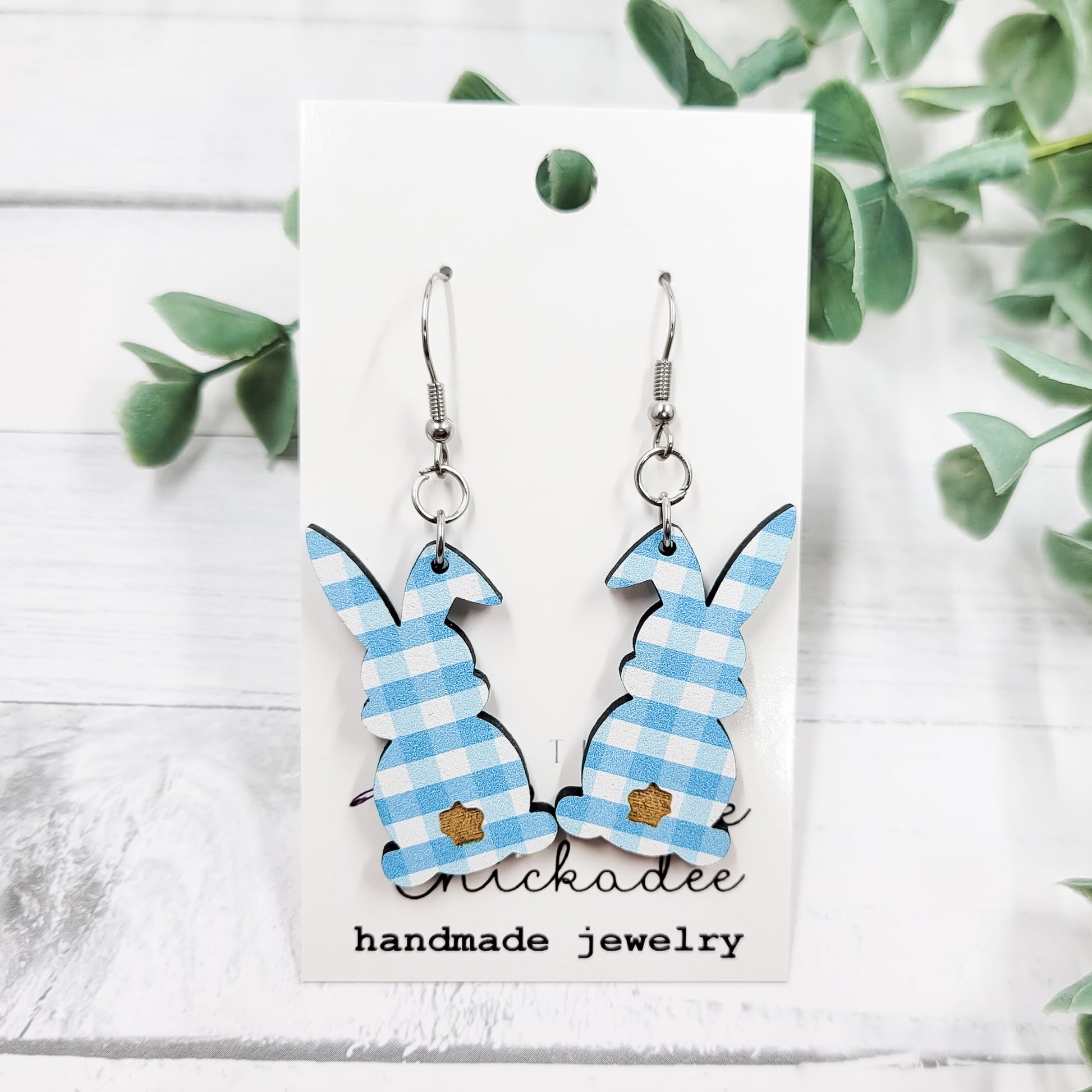 Blue Gingham Bunny Butts Wooden Dangle Earrings