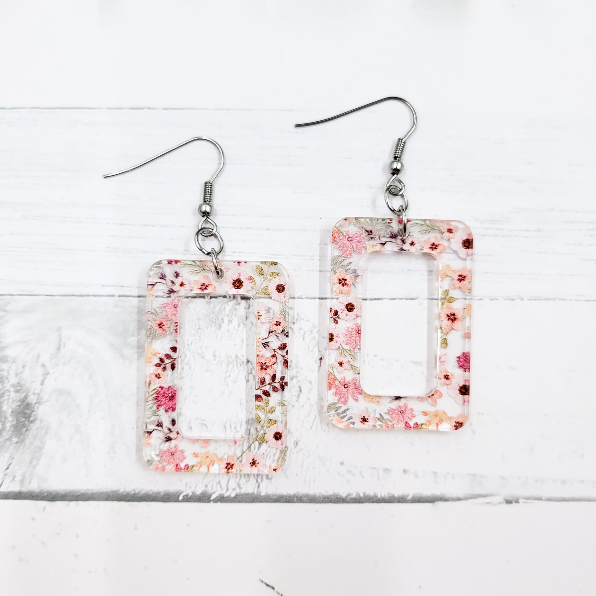Dusty Pink Floral Acrylic Open Rectangle Dangle Earrings