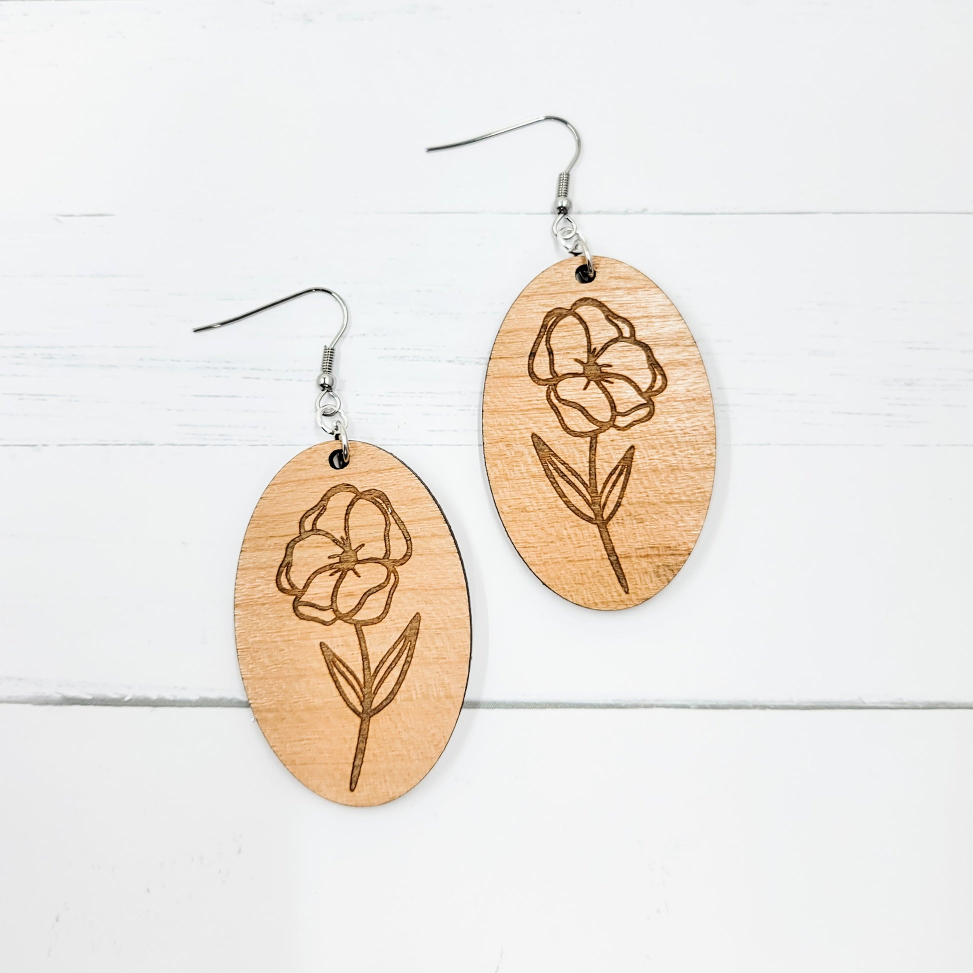 Engraved Flower Stem Oval Wooden Dangle Earrings
