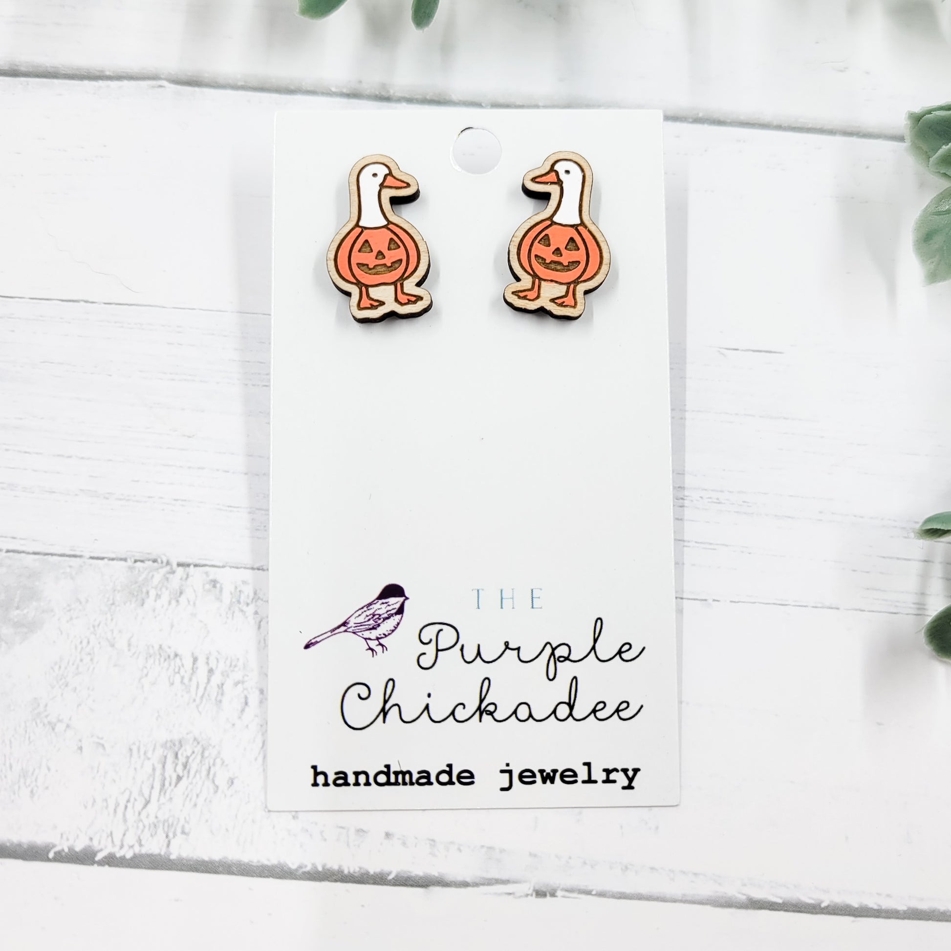 Goose In Pumpkin Handpainted Wooden Stud Earrings