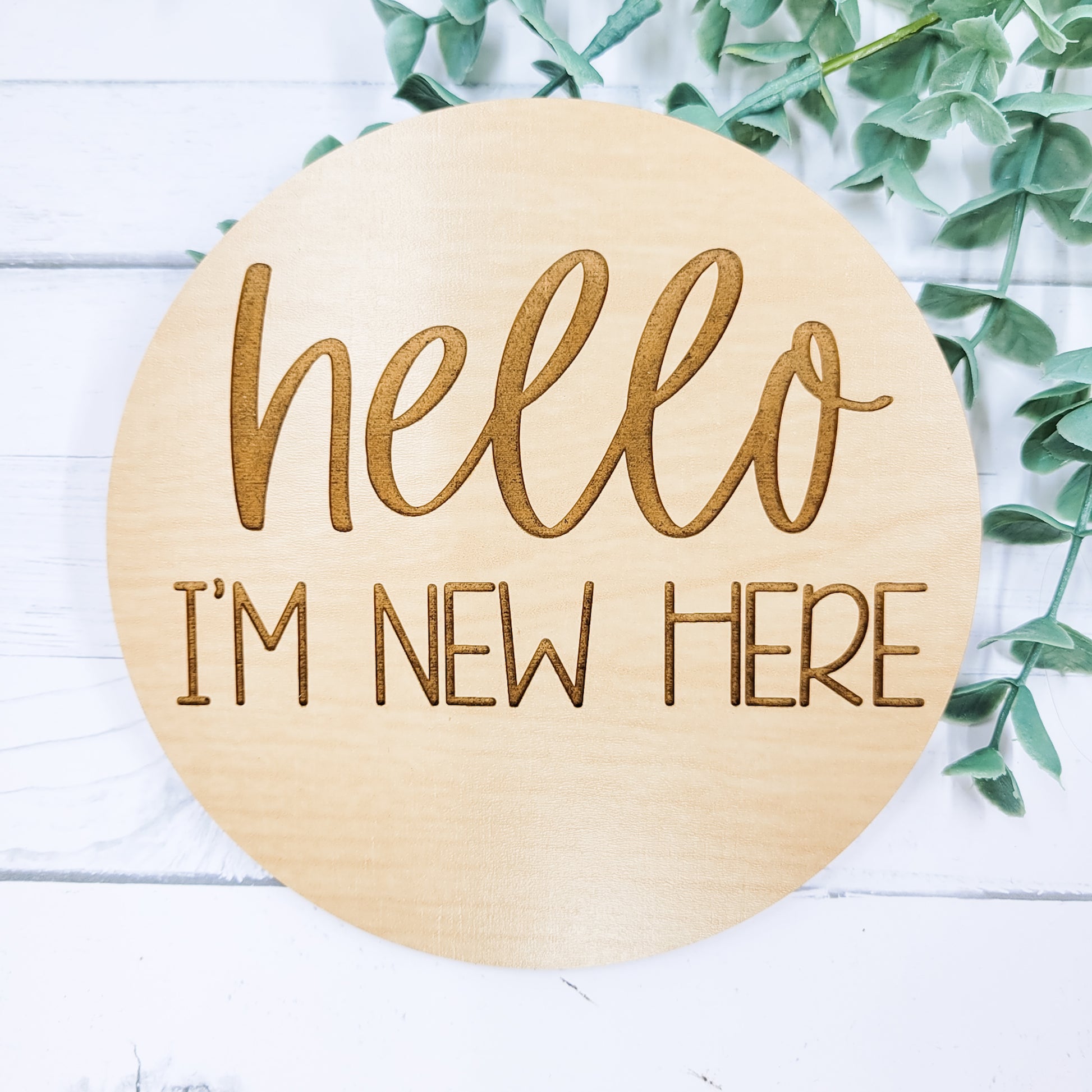 Hello I'm New Here Baby Birth Announcement Wooden Round Sign