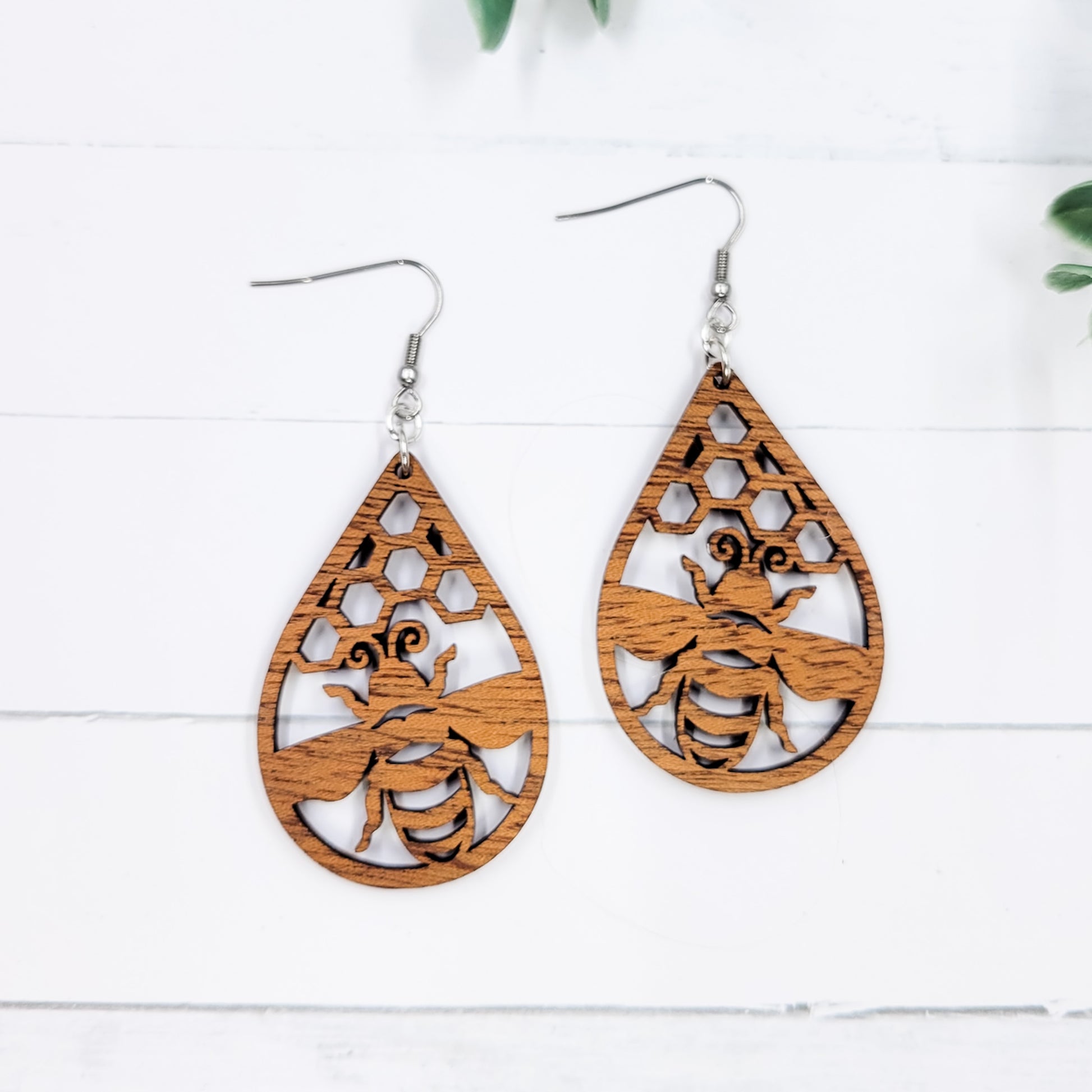 Honeycomb Bee Teardrop Wooden Dangle Earrings