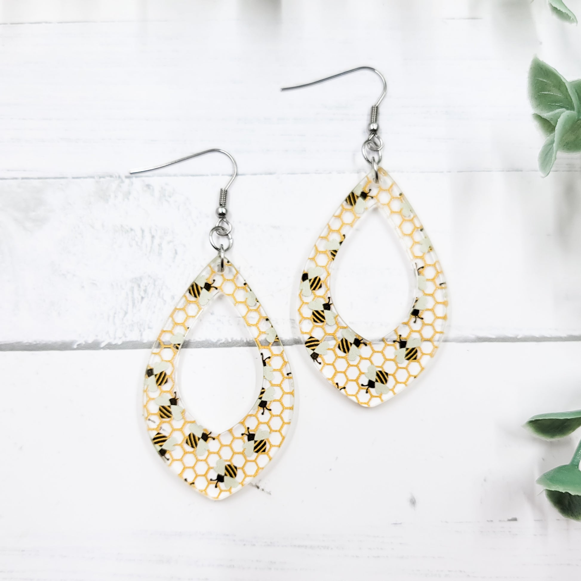 Earrings are made from commercially printed acrylic. Earrings are on stainless steel fish hook ear wires with rubber ear nuts.
