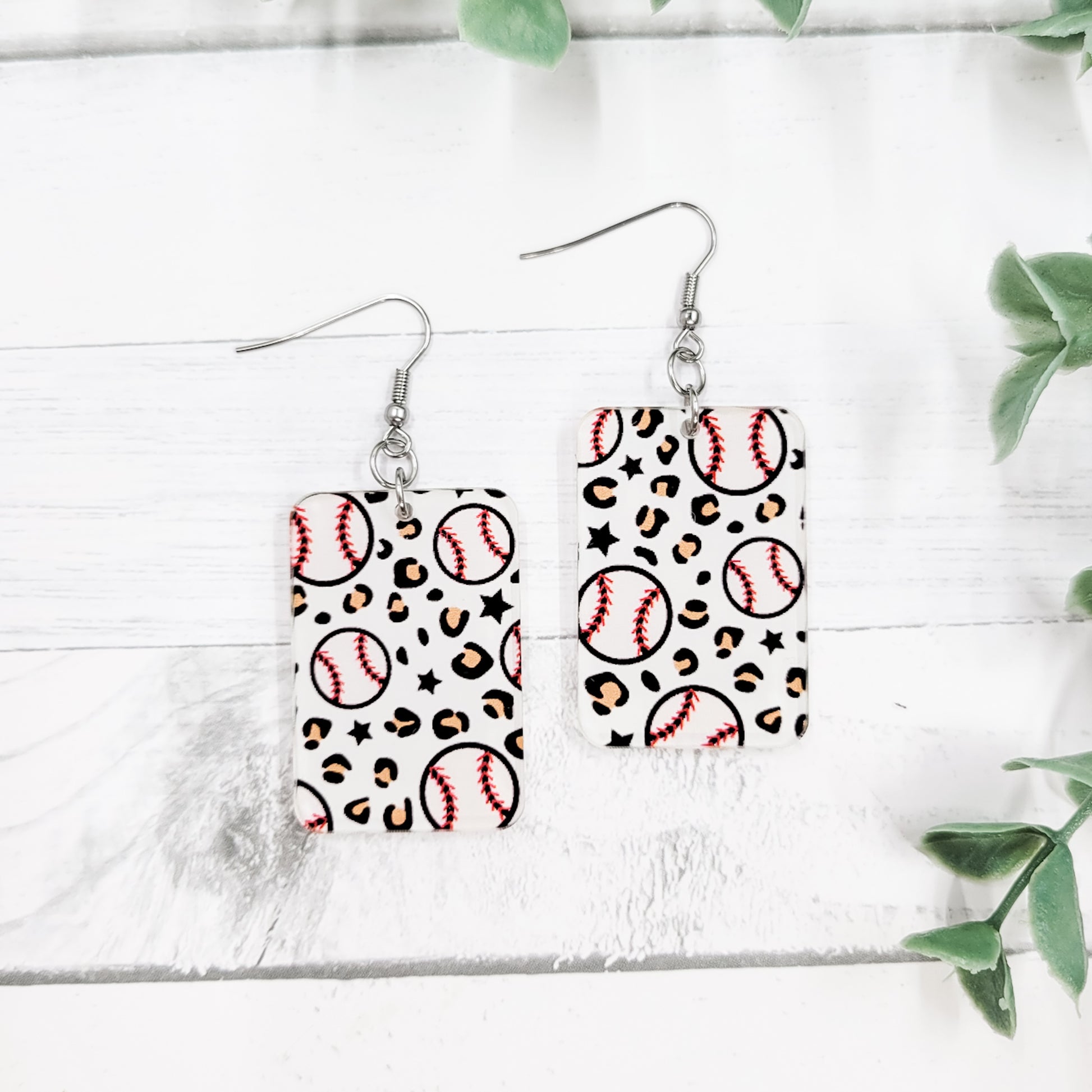 Leopard Baseballs Acrylic Rectangle Dangle Earrings