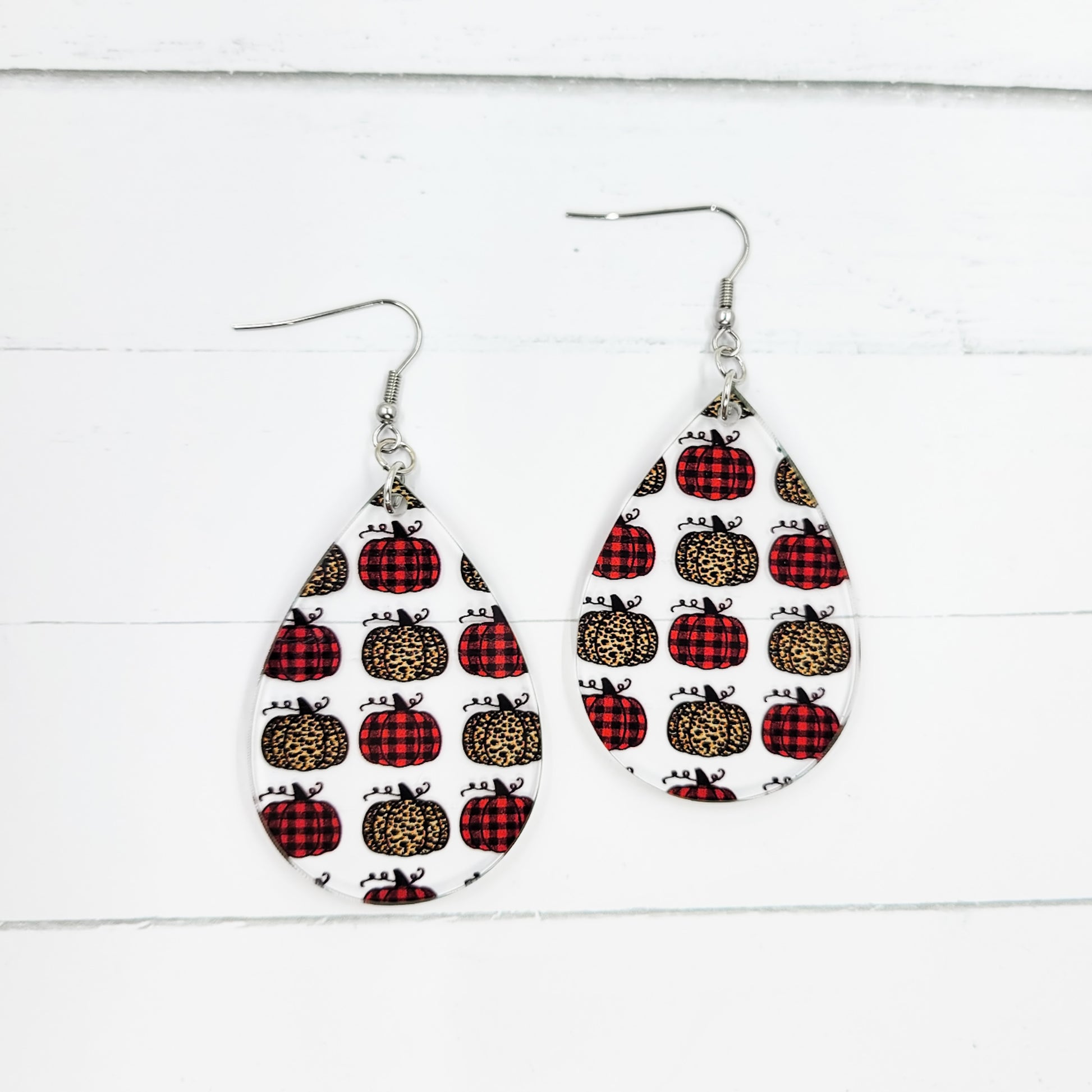 Leopard & Buffalo Plaid Pumpkins Acrylic Teardrop Dangle Earrings