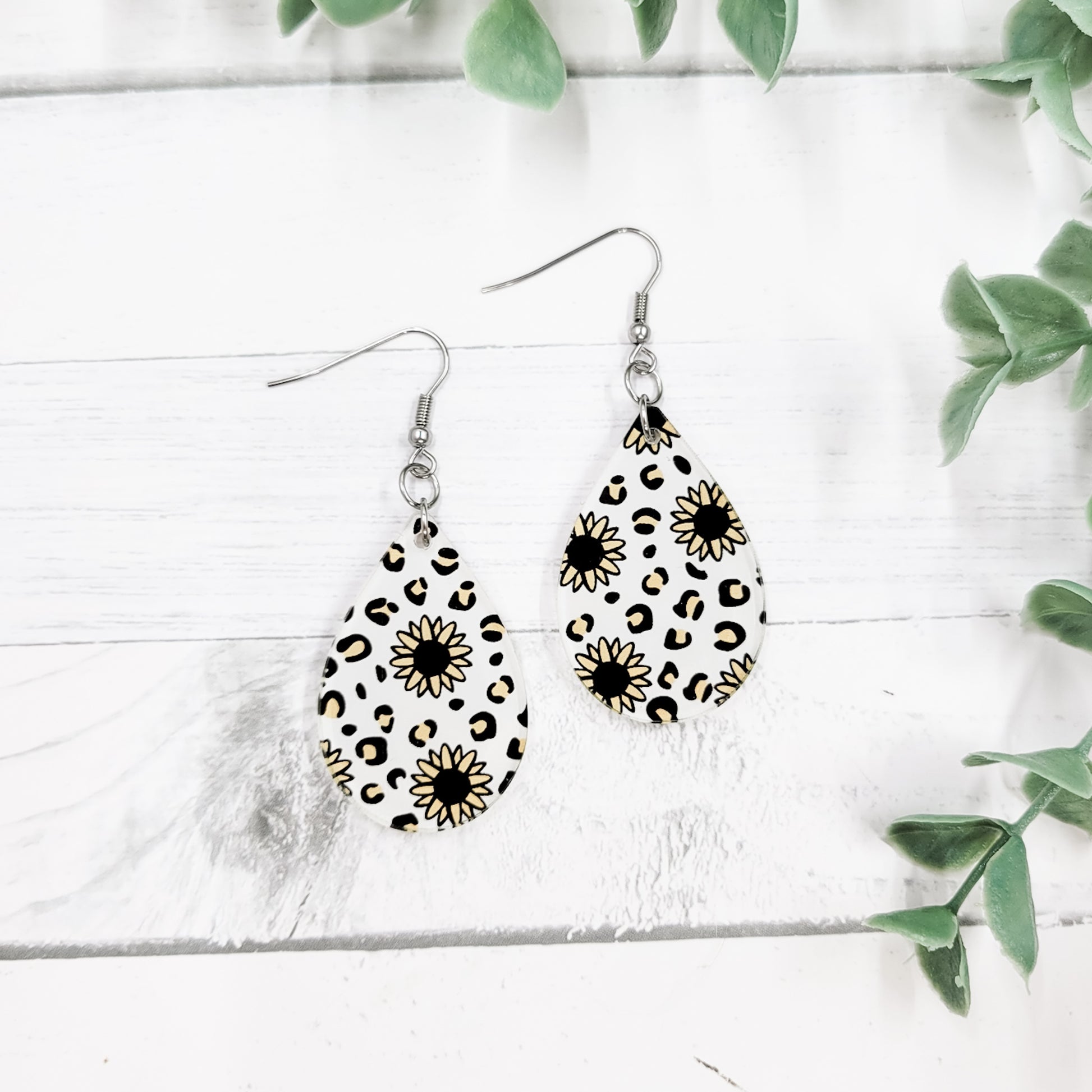 Leopard Sunflowers Acrylic Teardrop Dangle Earrings