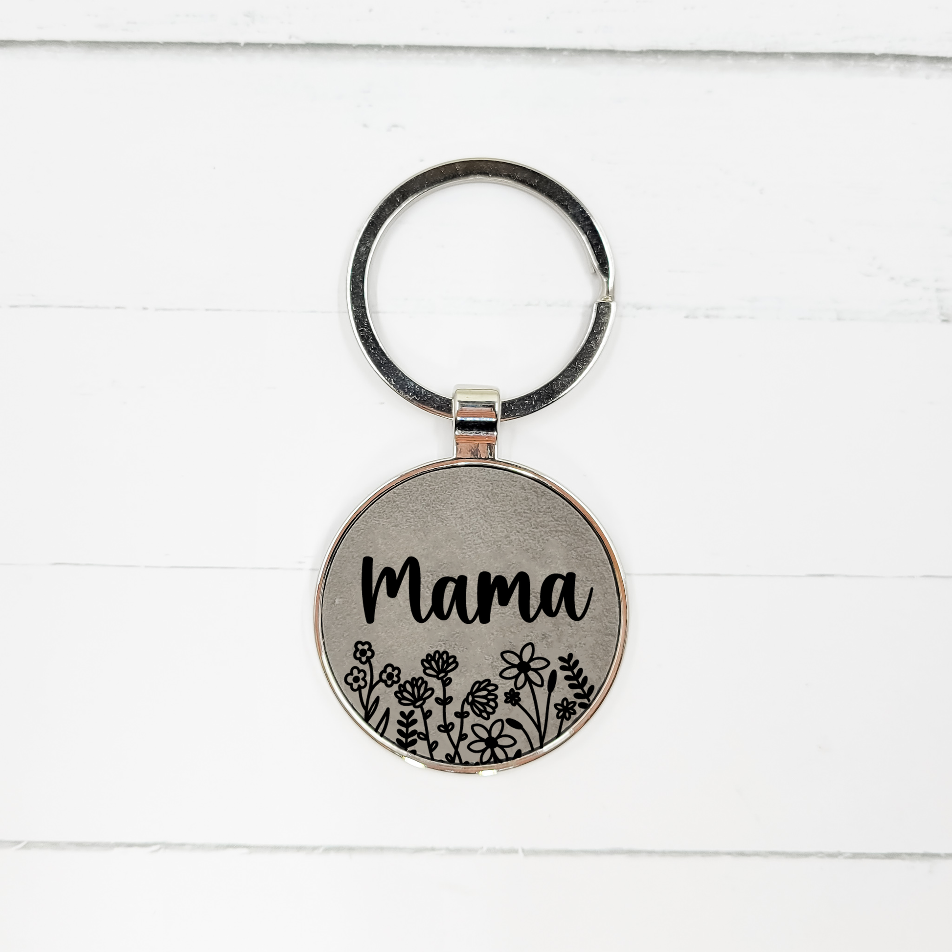 "Mama" Floral Grey Engraved Leatherette Keychain