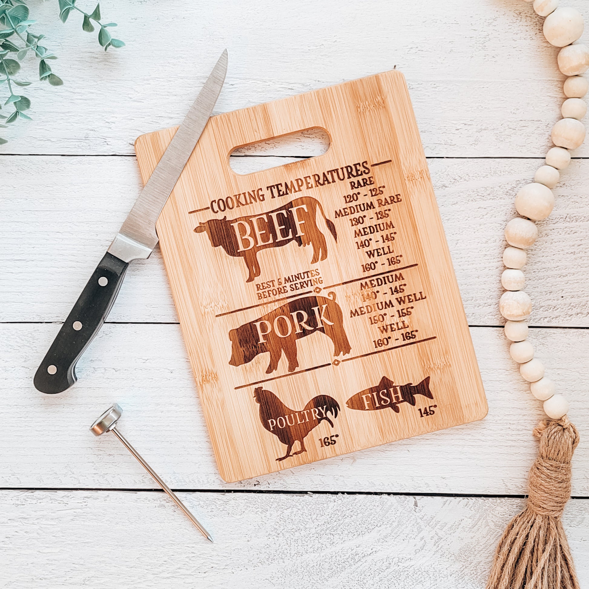 Have you ever forgotten the cooked temperature for meat? Add this cute engraved bamboo cutting board to your kitchen décor and never have to look up it up again!