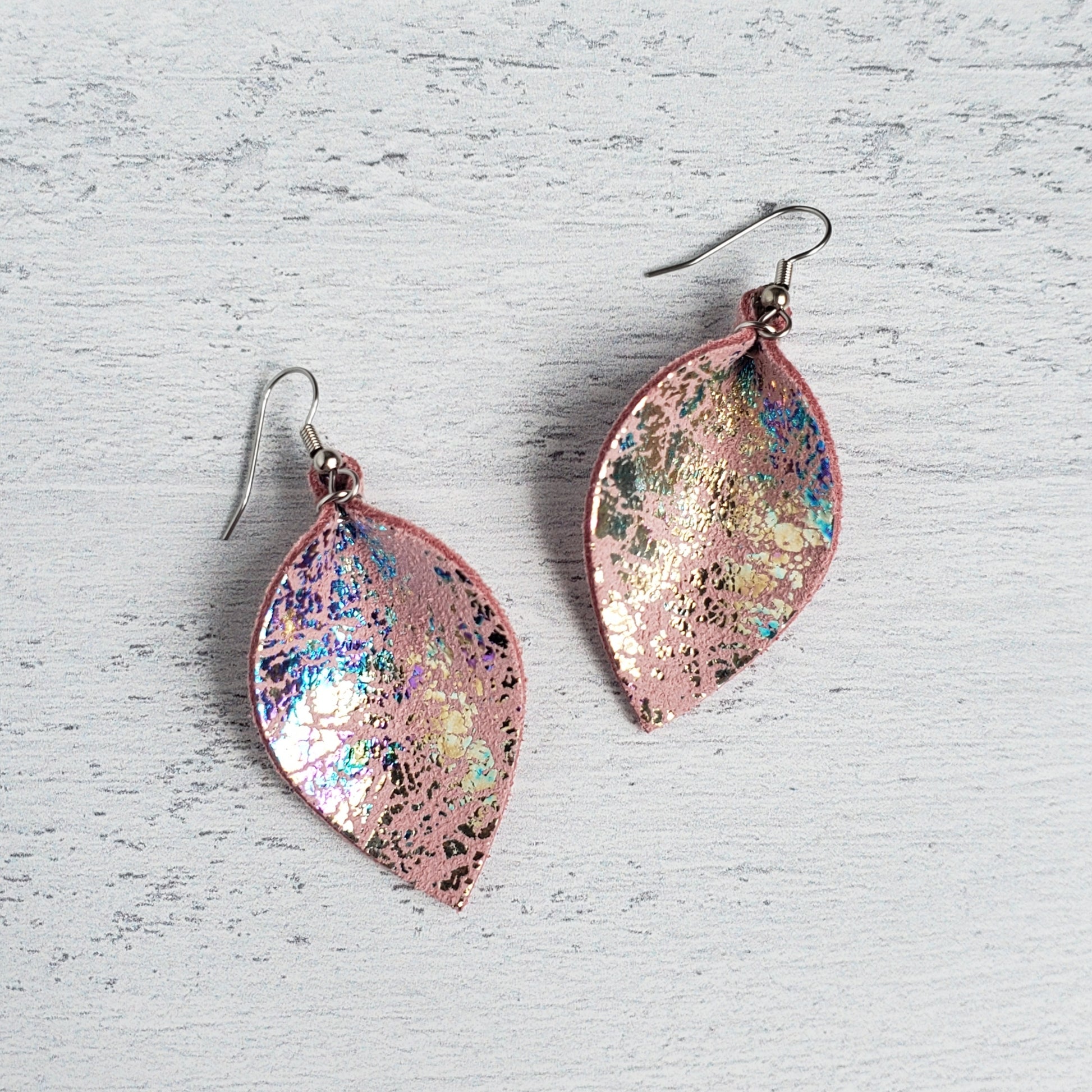 Our pinched leaf style earrings are so lightweight you may forget you are wearing them! All earring wires are stainless steel and nickel and lead free!
