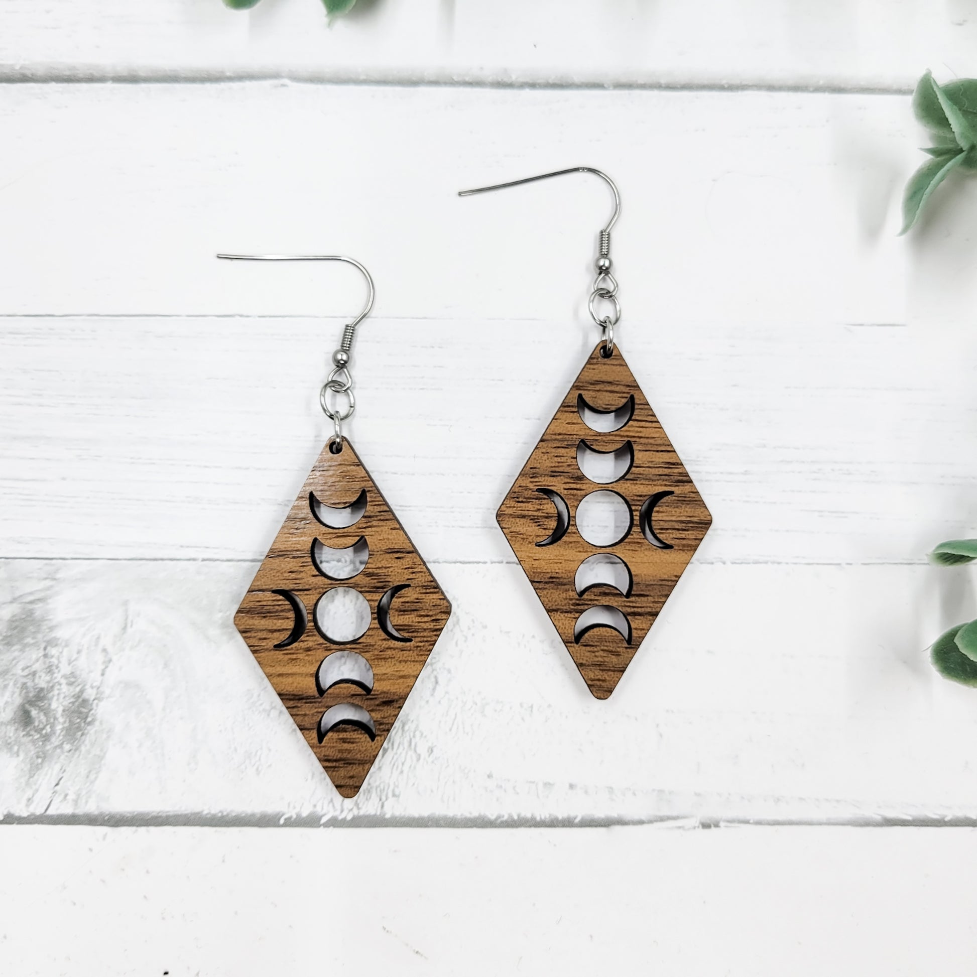 Moon Phases Diamond Wooden Dangle Earrings - Celestial Jewelry - Astrology