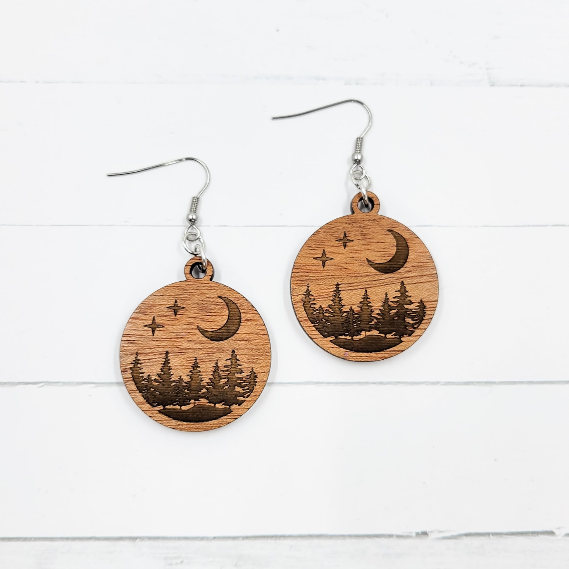 Earrings are made from sapele wood and may naturally darken over time. Earrings are on stainless steel fish hook ear wires with rubber ear nuts.