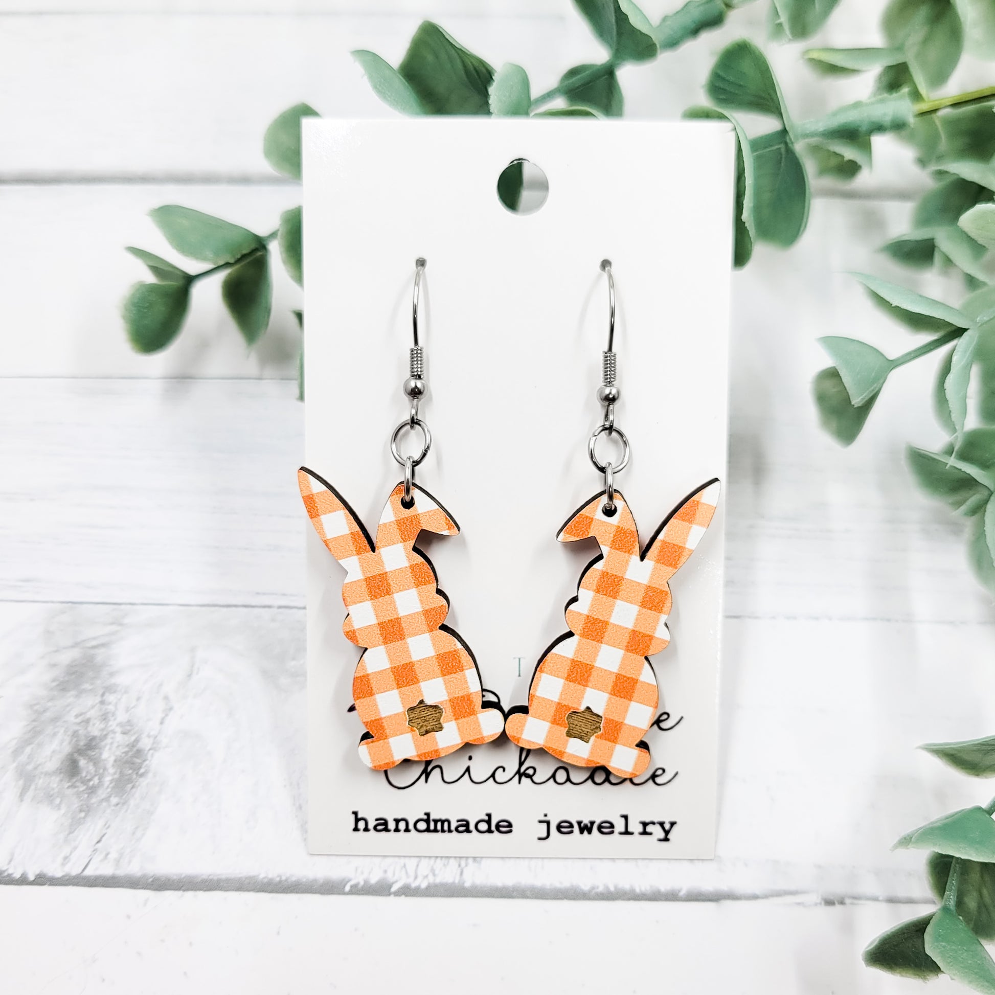 Orange Gingham Bunny Butts Wooden Dangle Earrings