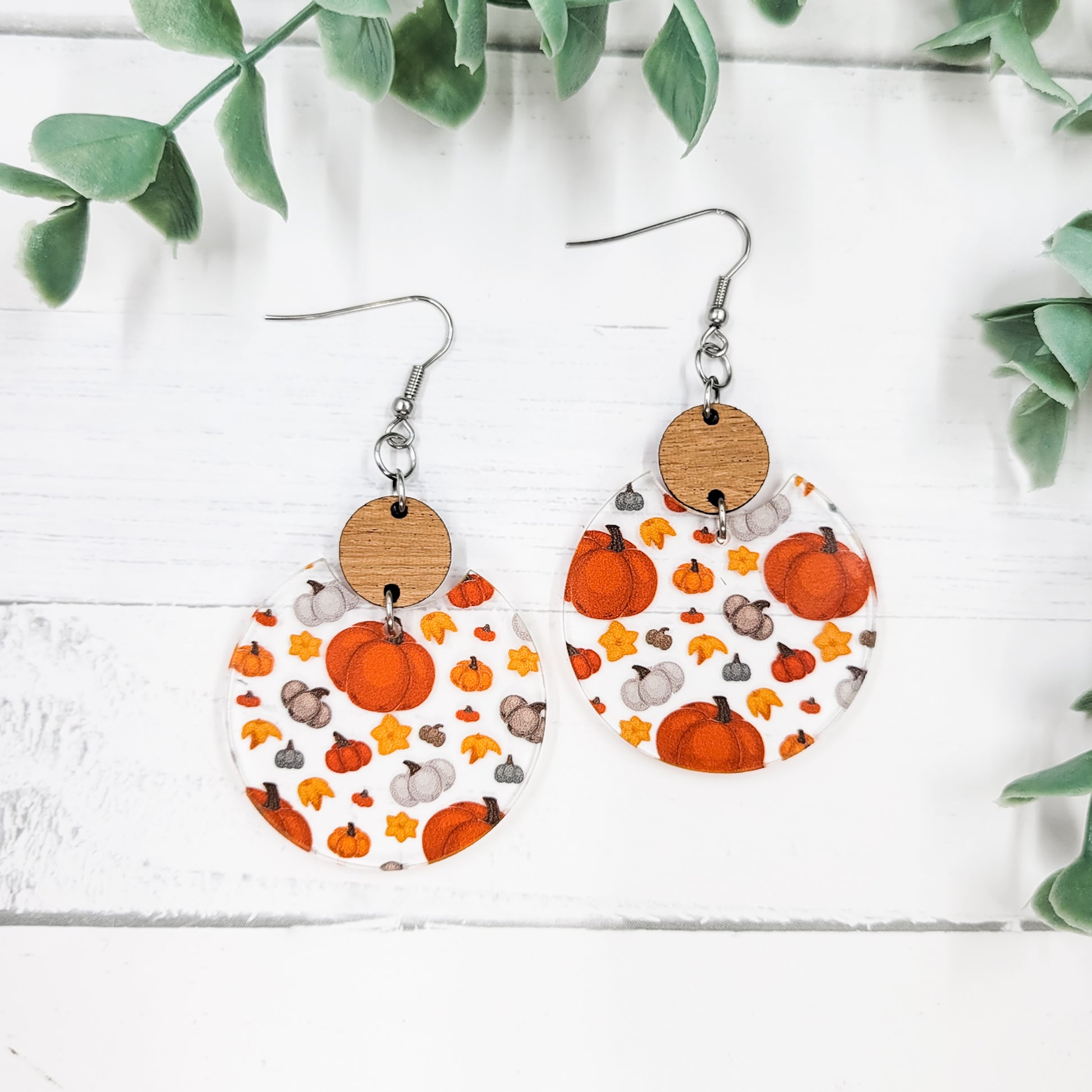 Orange & Grey Pumpkins Acrylic Semi Circle Dangle Earrings
