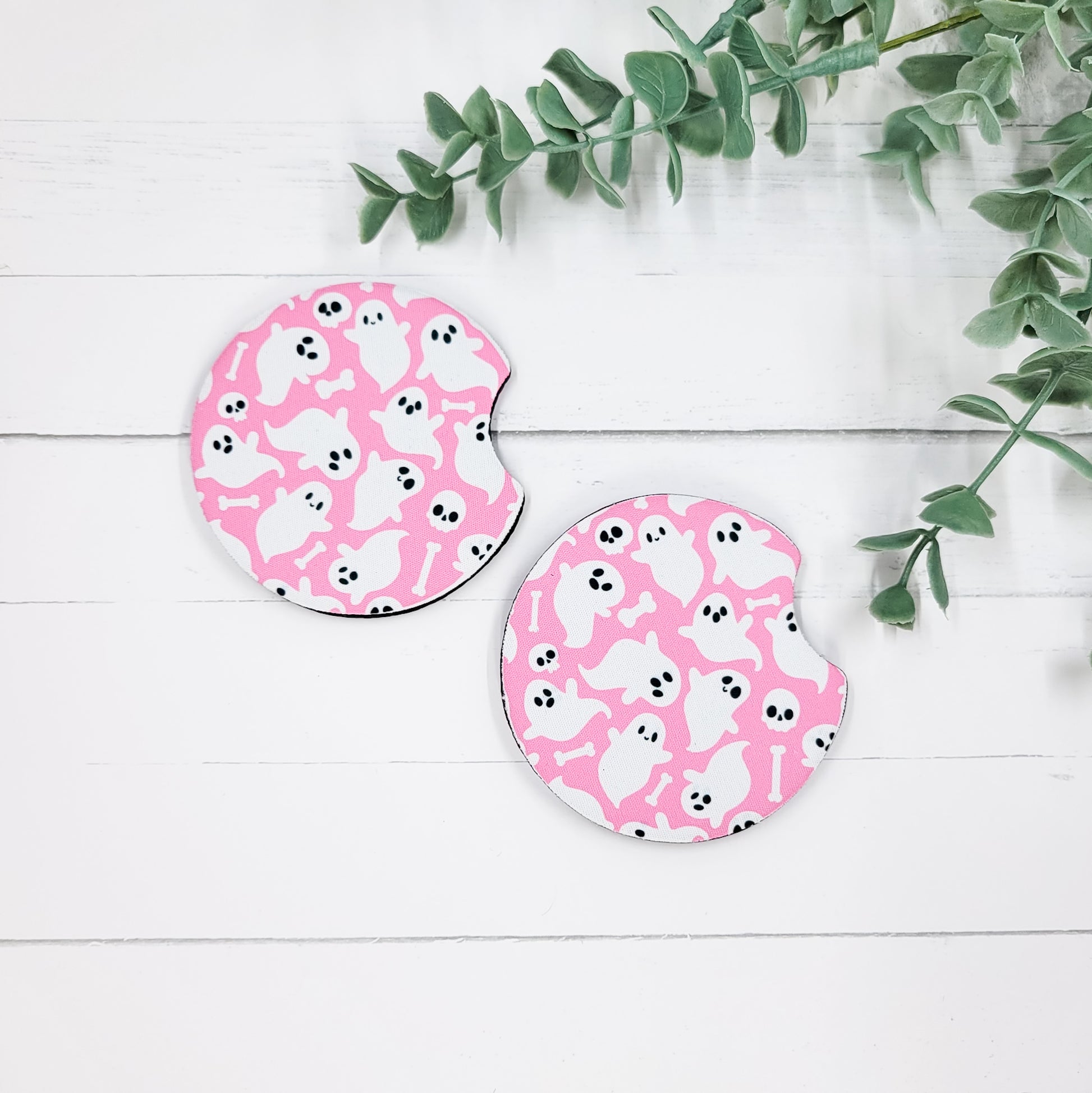 Pink Ghost Neoprene Car Coasters – Spooky Cute Halloween (Set of 2)