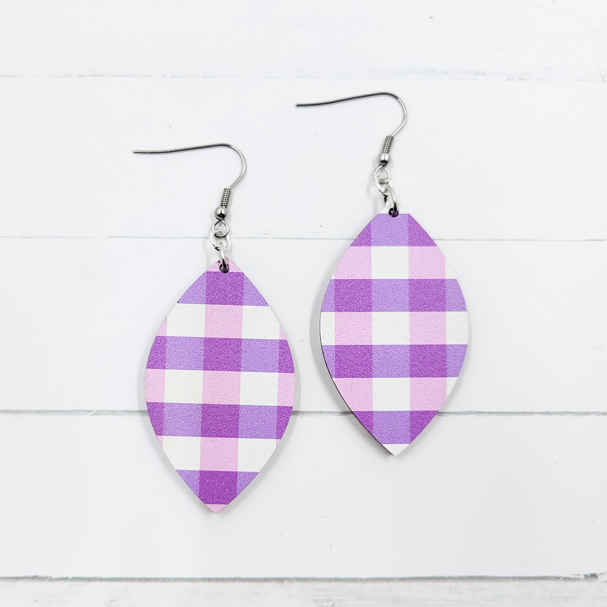 Purple Gingham Pointed Petal Wooden Dangle Earrings