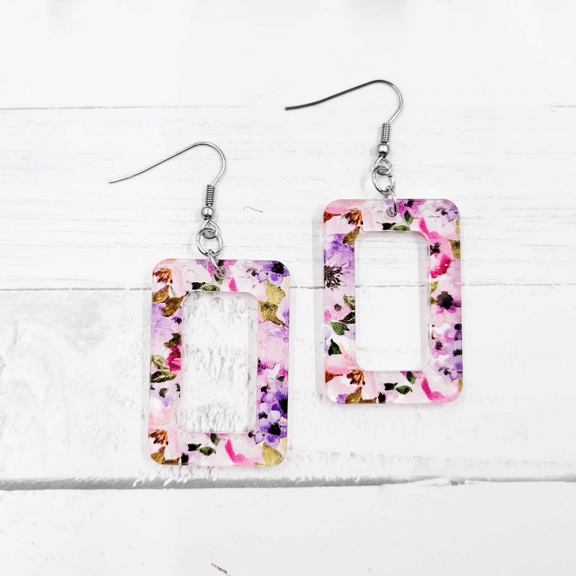 Purple Watercolor Floral Acrylic Open Rectangle Dangle Earrings