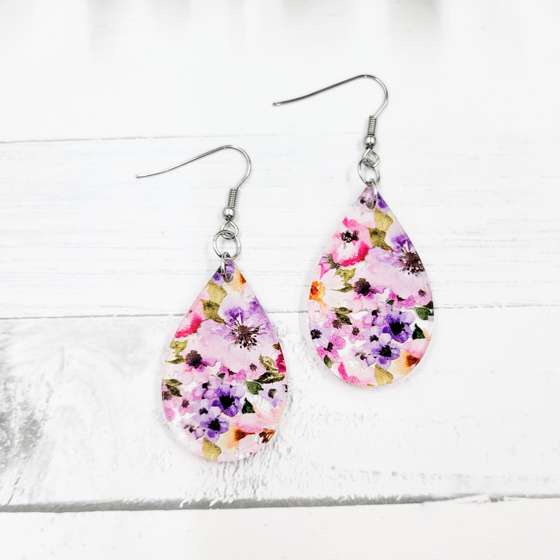Purple Watercolor Floral Acrylic Teardrop Dangle Earrings