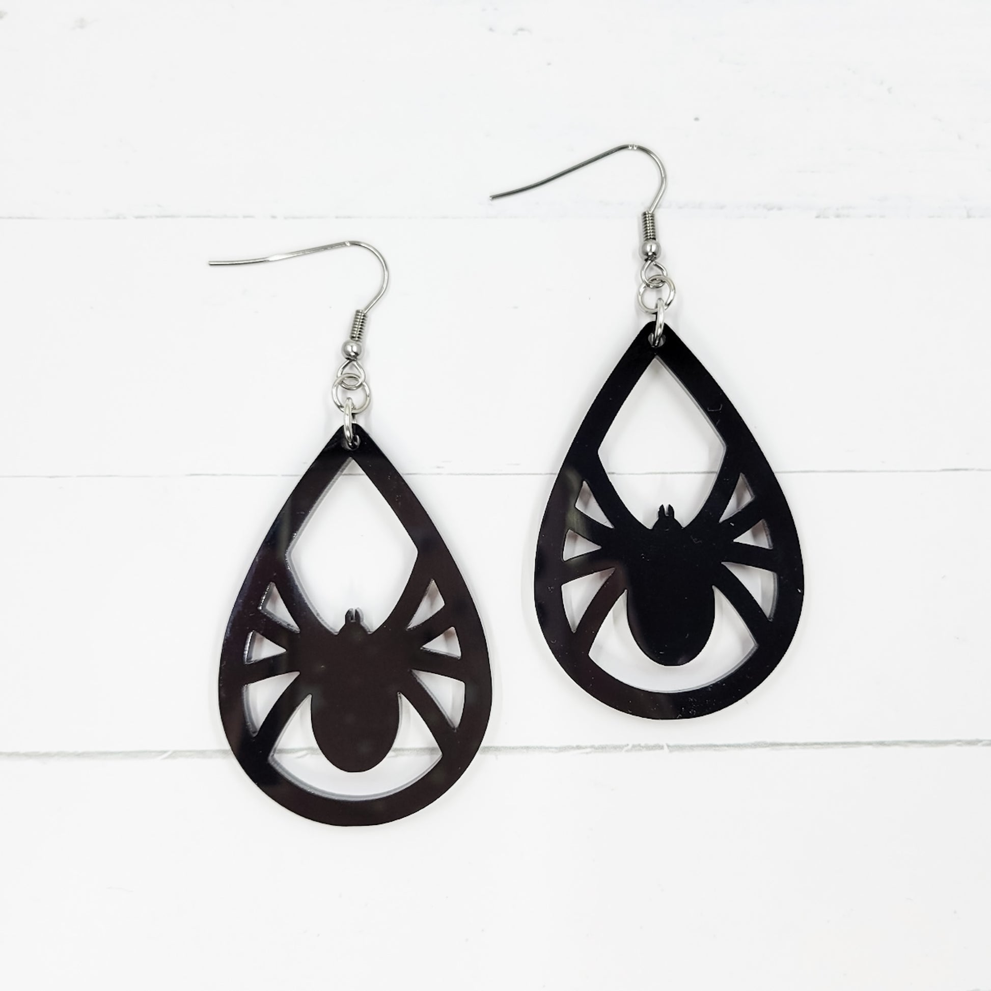 Earrings are made from black gloss acrylic. Earrings are on stainless steel fish hook ear wires with rubber ear nuts.