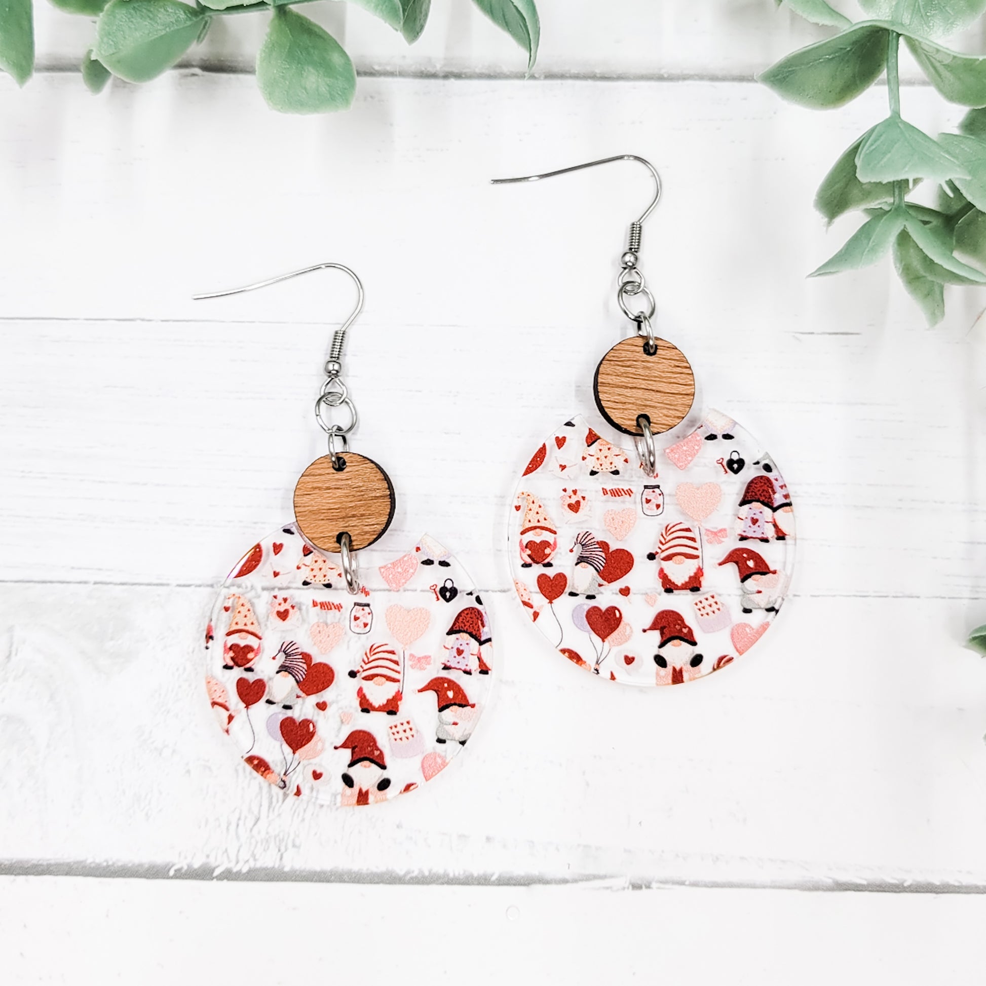 Valentines Gnomes Clear Acrylic Semi Circle Dangle Earrings