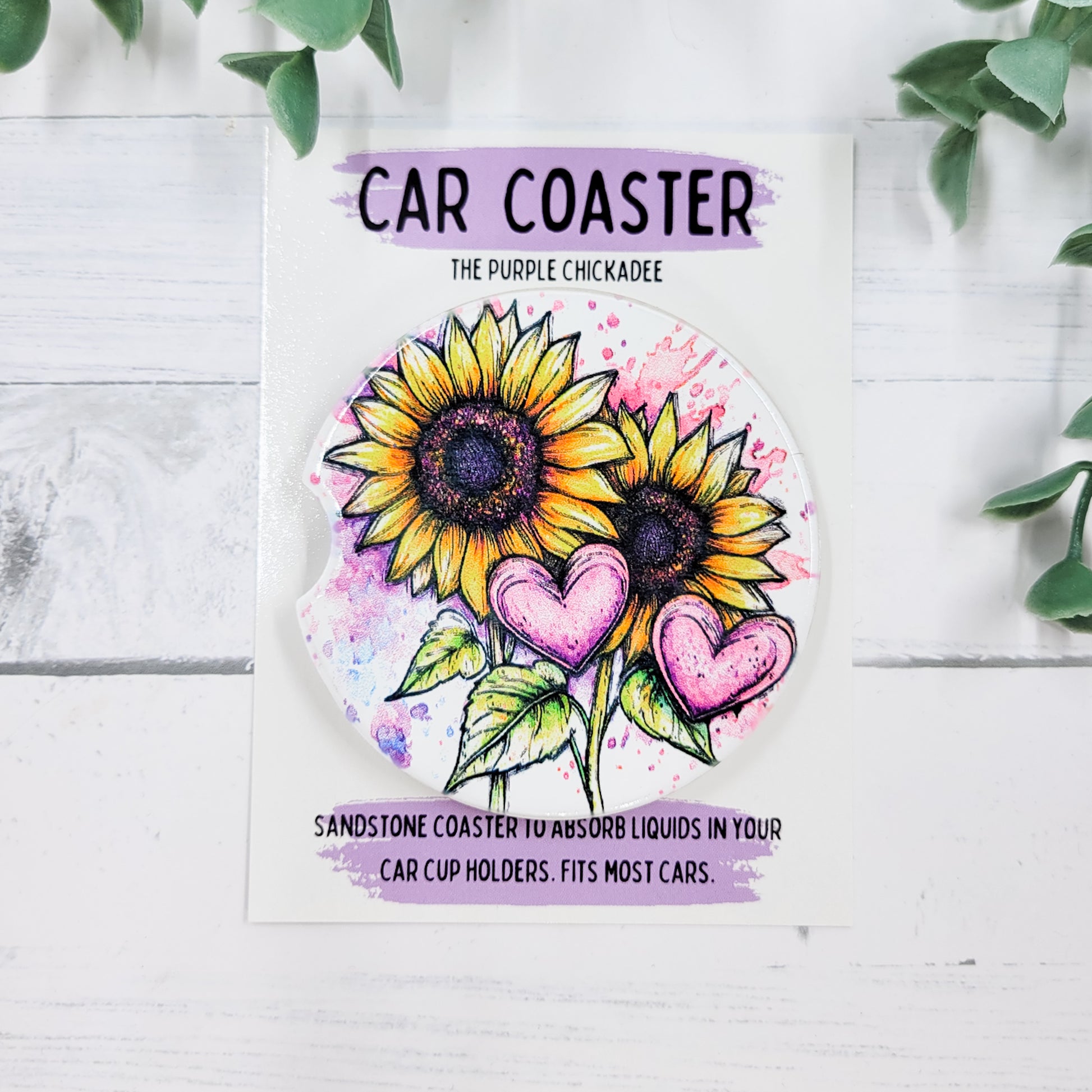 Watercolor Sunflowers & Hearts Sandstone Car Coaster